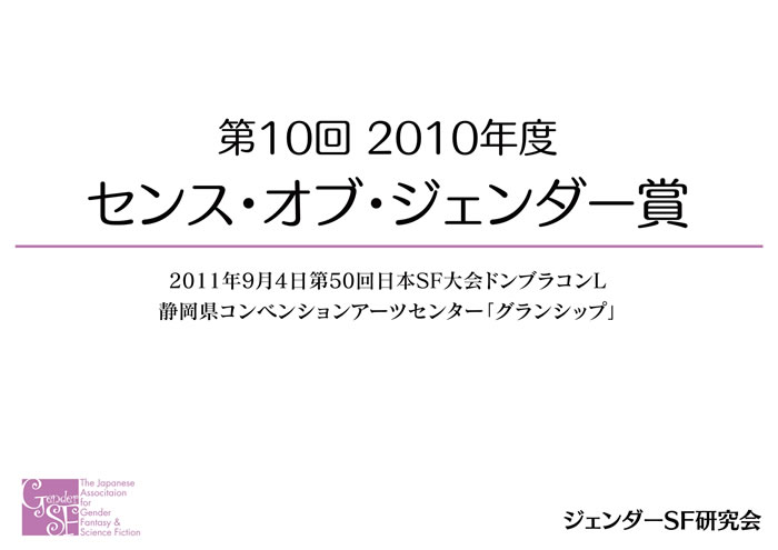 2010年度 第10回Sense of Gender賞授賞式は2011年9月4日、第50回日本SF大会 ドンブラコンL(静岡県・コンベンションアーツセンター グランシップ)クロージングにて行われました。授賞式の写真は山本浩之さまからご提供いただきました。