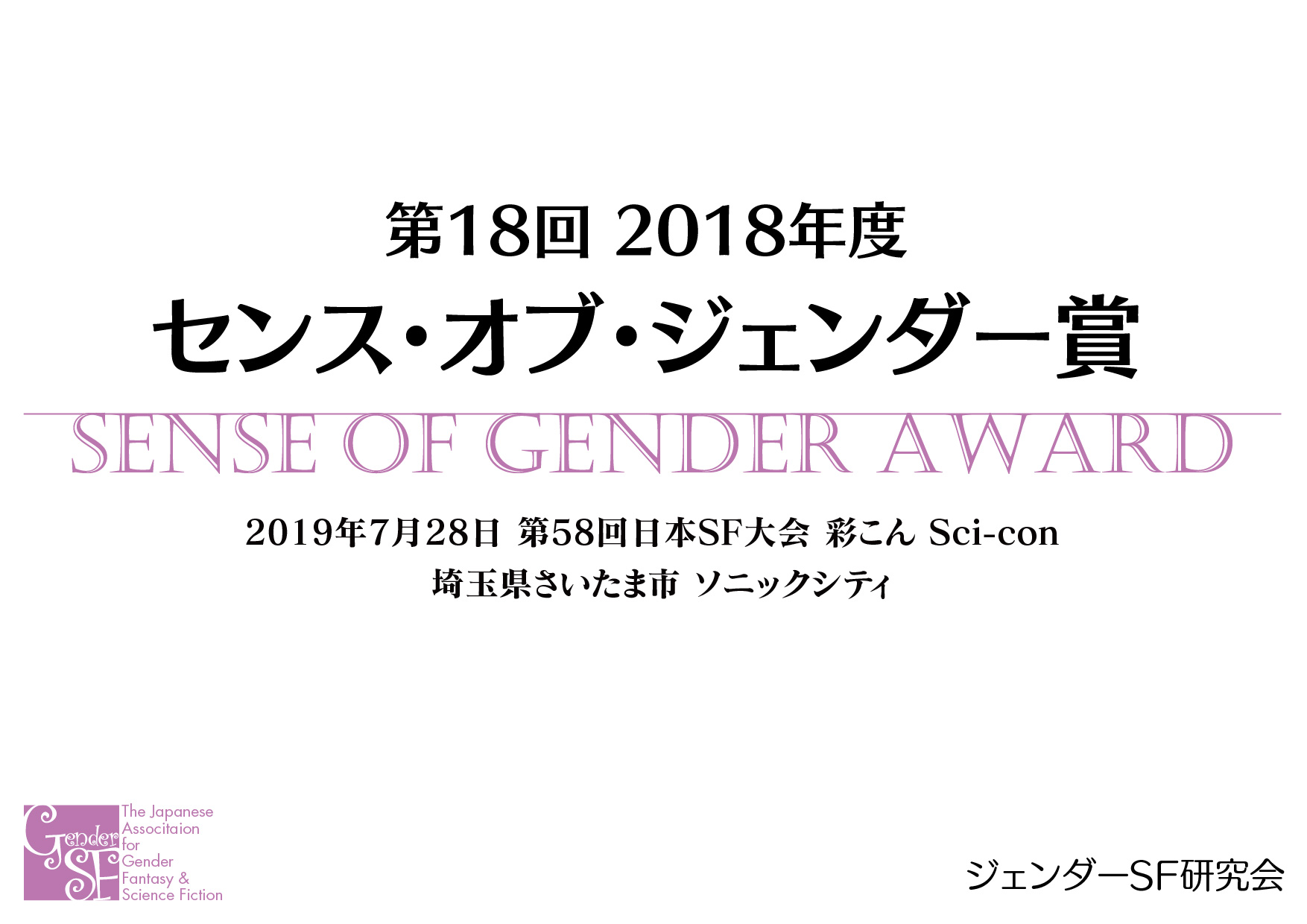 2018年度 第18回Sense of Gender賞は2019年7月28日(日)、第58回日本SF大会 彩こん Sci-con(埼玉県さいたま市 ソニックシティ)にて発表されました。
