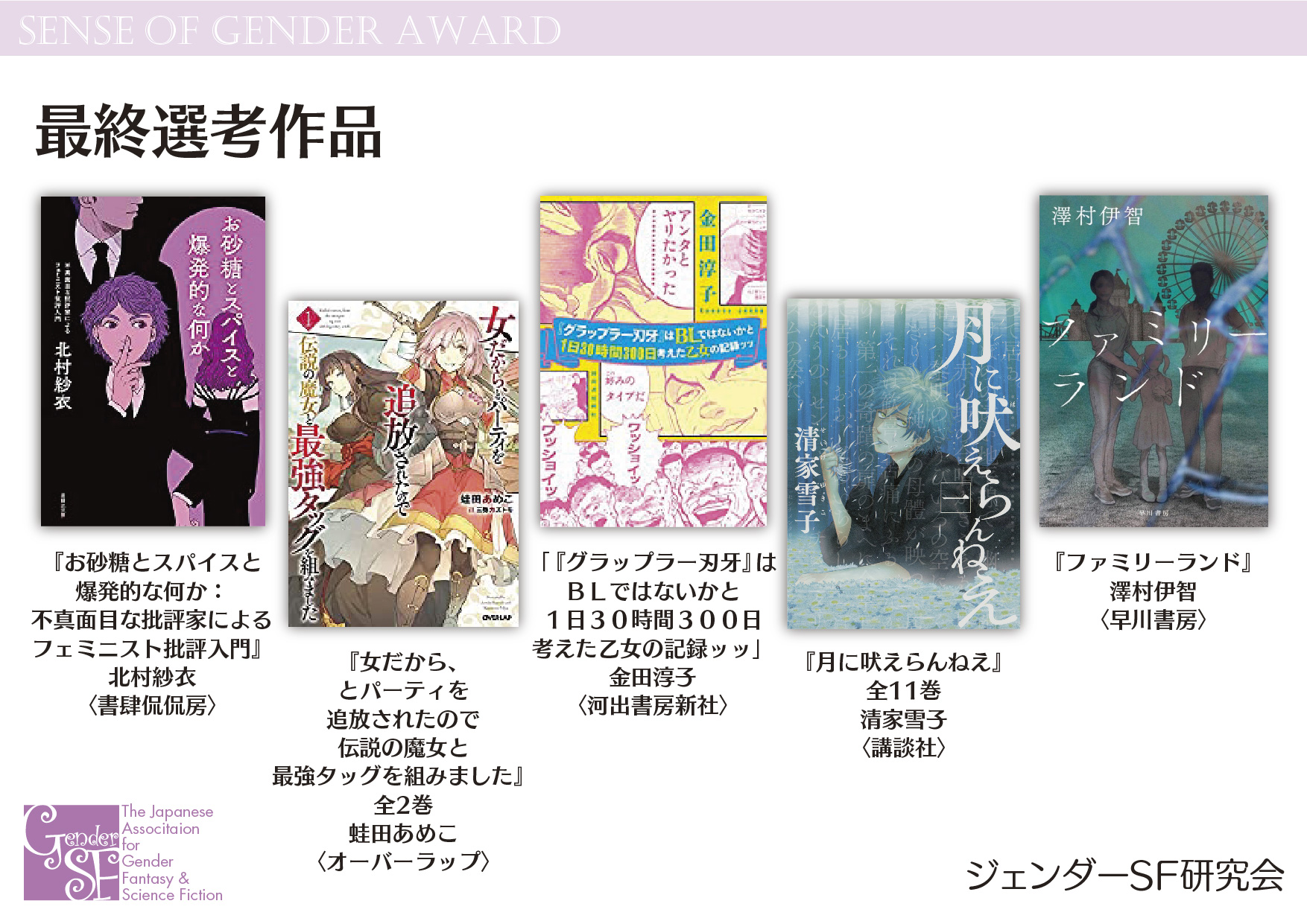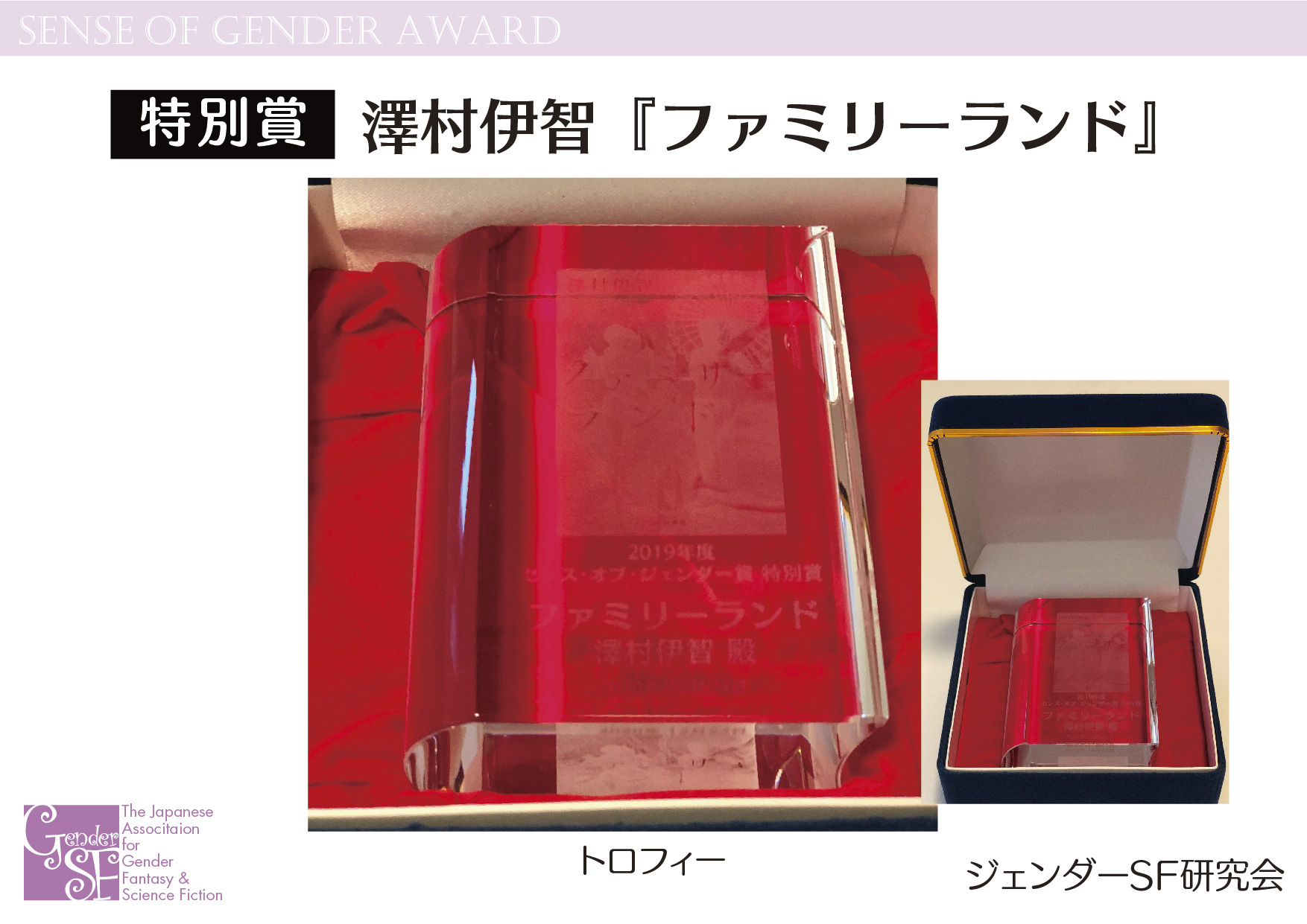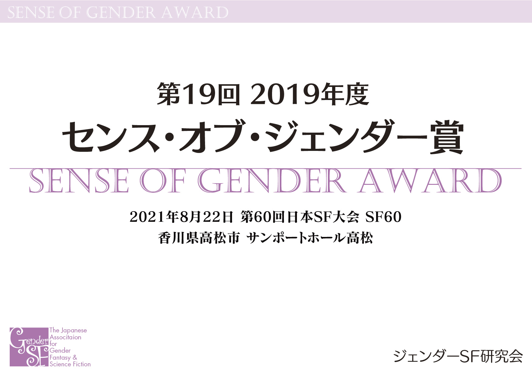 2019年度 第19回Sense of Gender賞は2020年12月24日(木)、ジェンダーSF研究会公式サイト(当ページ)にて発表されました。授賞式は第60回日本SF大会『SF60』(2021年8月21日(土)22日(日)/香川県・サンポートホール高松)にて行われました。