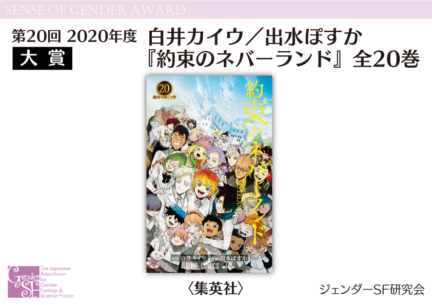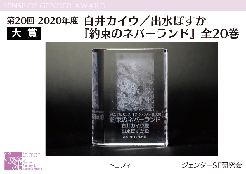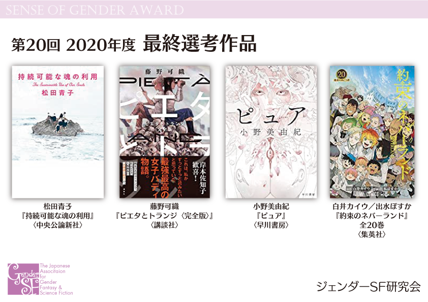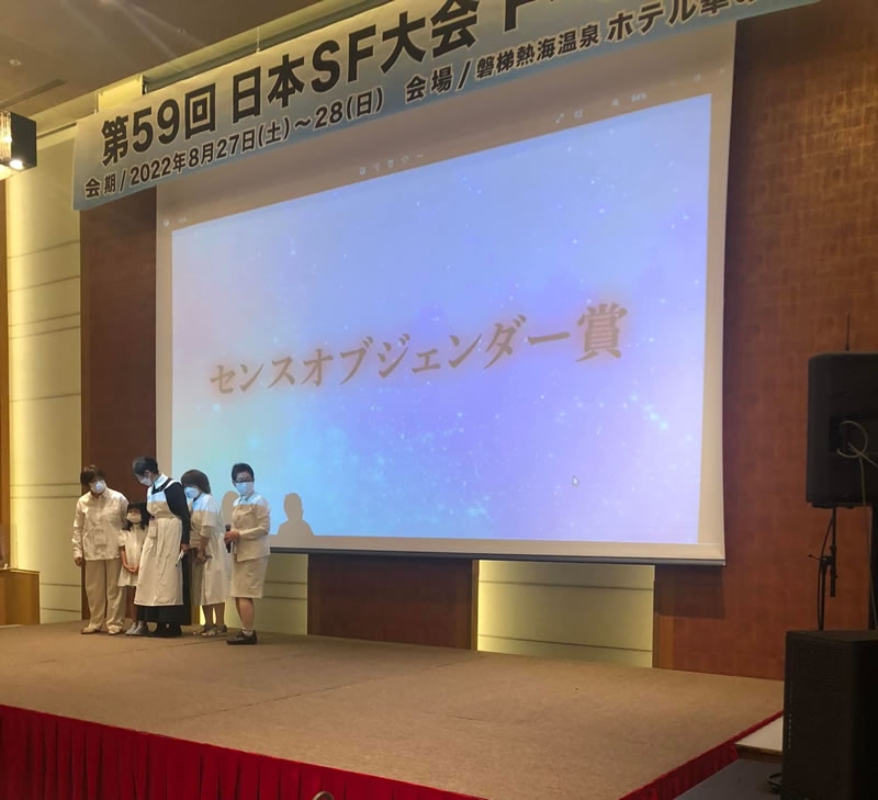 2020年度 第20回Sense of Gender賞は2021年12月25日(土)、ジェンダーSF研究会公式サイト(当ページ)にて発表されました。授賞式は第59回日本SF大会『F-CON』(2022年8月27日(土)28日(日)/福島県・ホテル 華の湯)にて、2021年度 第21回Sense of Gender賞と合同で行われました。